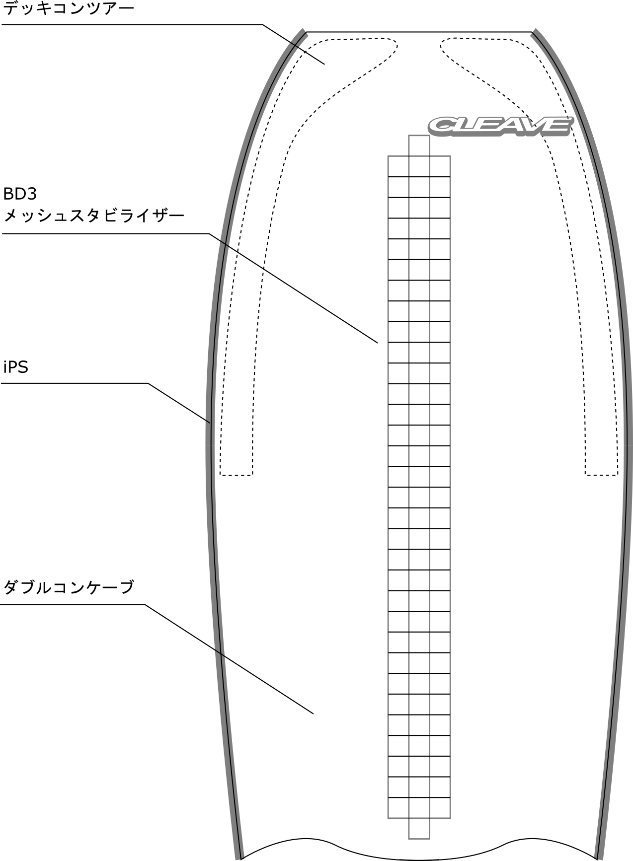 国内生産ハイクオリティーポリプロピレンコアに、CLEAVE独自のテクノロジーであるメッシュスタビライザーとiPSを備えています。セッティングは少し厚めにし、ボード幅を抑えることで、走りながらもキビキビとコントロールすることができます。スピード性能とコントロール性能を高い次元で併せ持つボードです。
