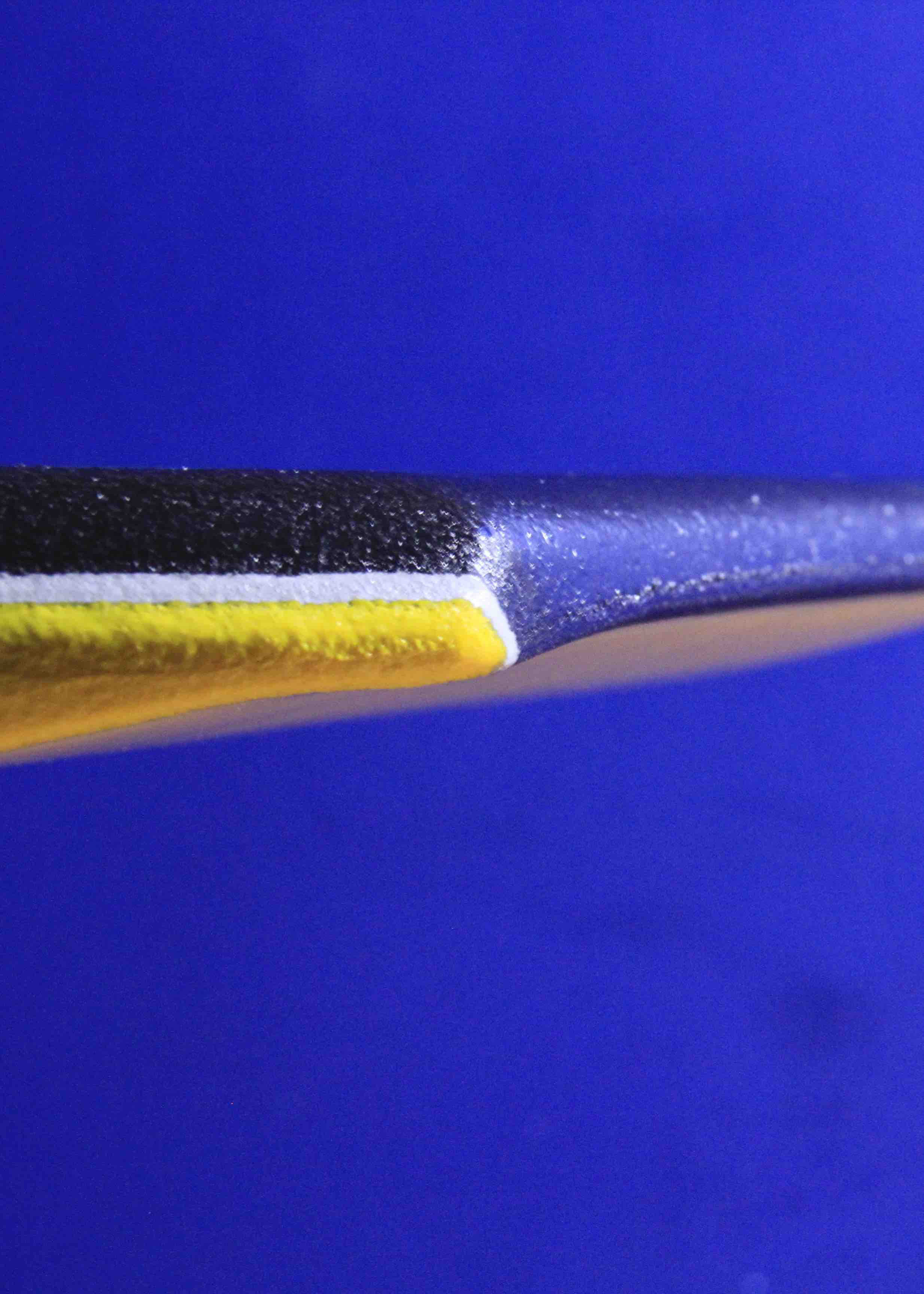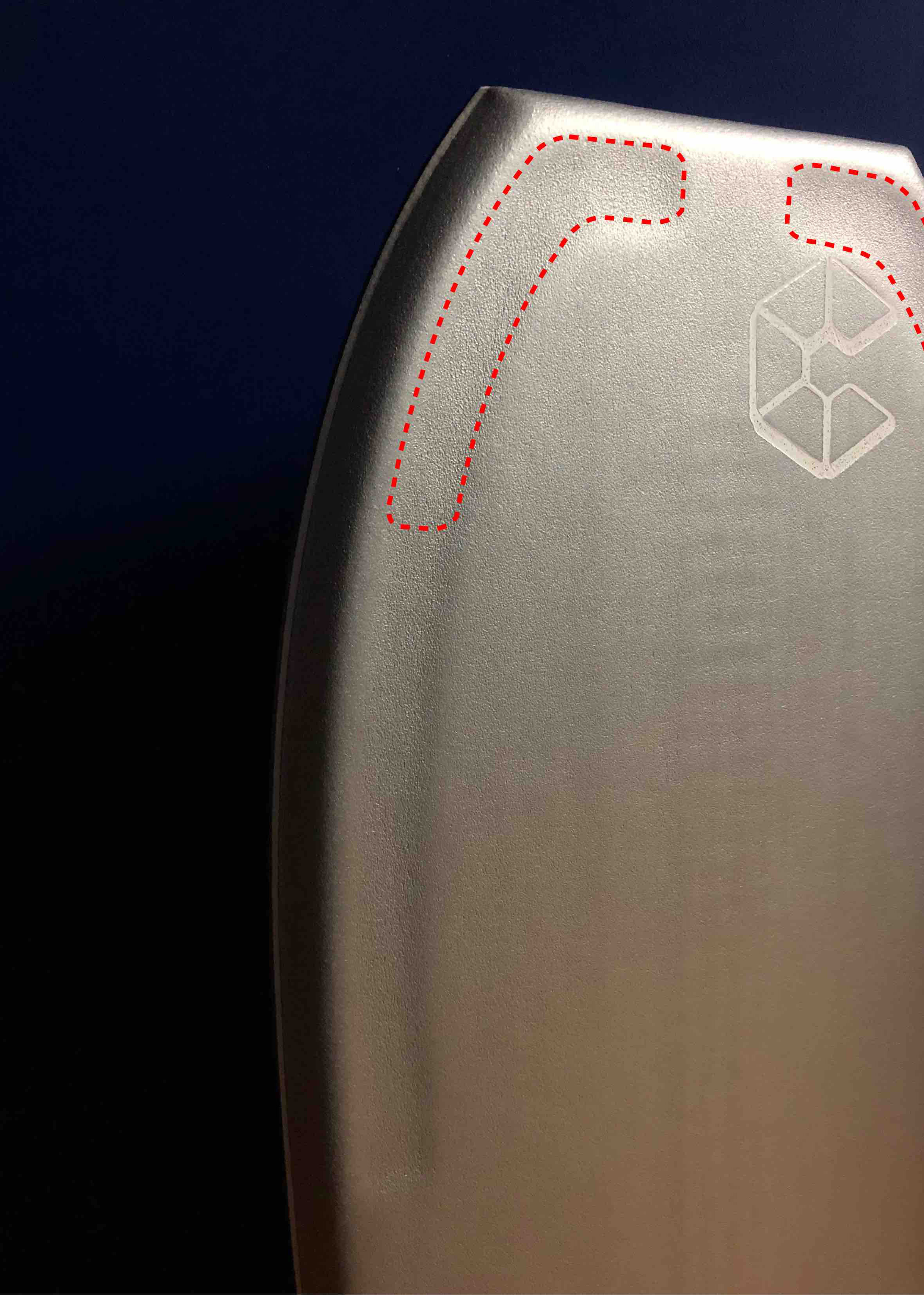 大きい波や掘れた波に対してボードのトラクション(引っ掛かり)を生み出すためのデザインです。コンケーブのような考えからではなく、波に引っ掛けたいテール隅の部分を彫る(凹)ことで表面積を広くし、水に対しての抵抗を作り出しトラクションを得ることができるボトムシェイプです。